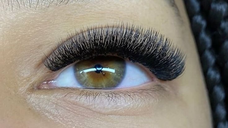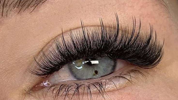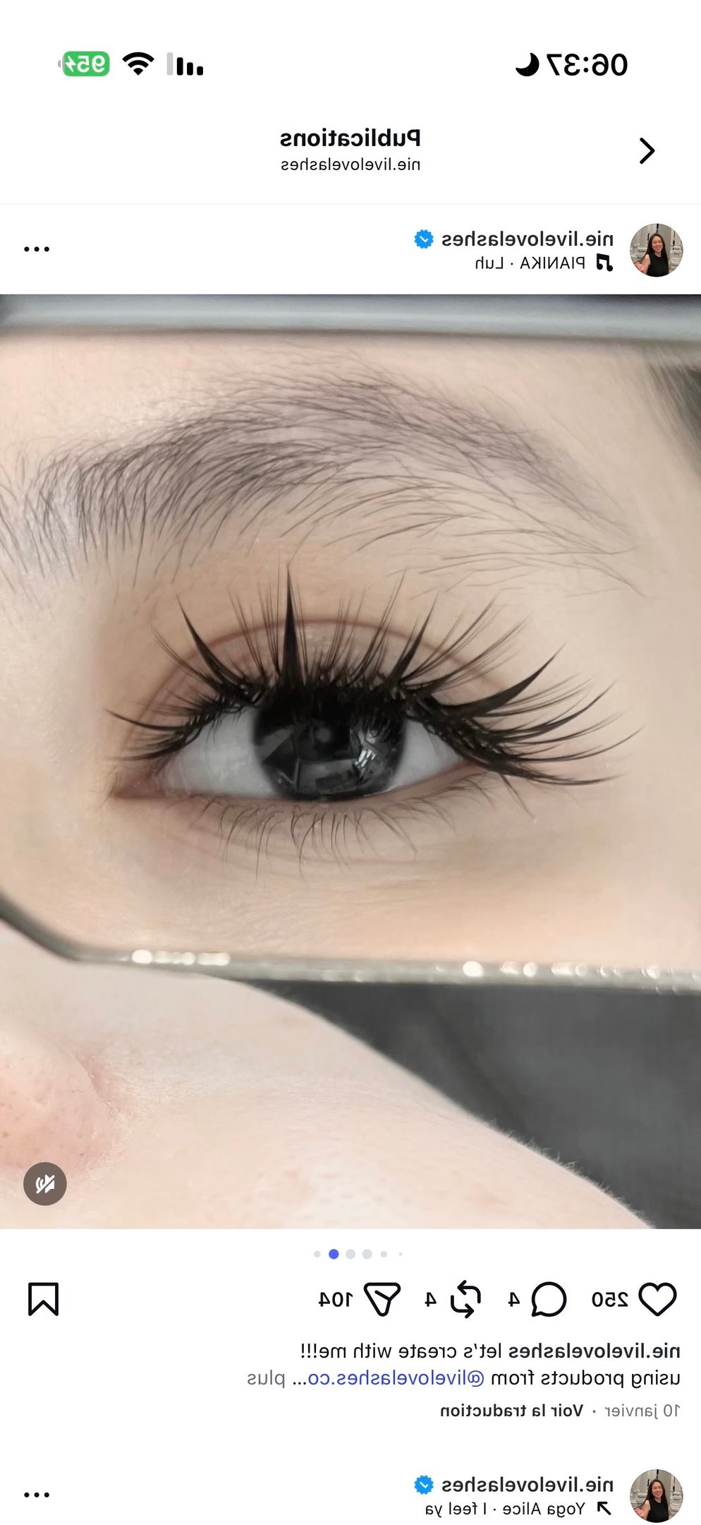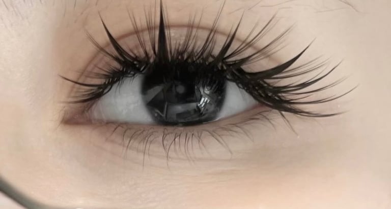 Pose d'extensions similaire au volume intense avec un effet wispy en plus, pour un rendu destructuré - faux cils